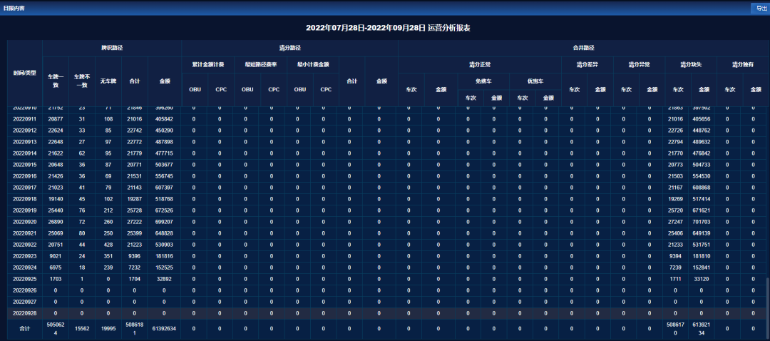 實現(xiàn)自動運行分析統(tǒng)計,統(tǒng)計每日系統(tǒng)稽核分析結(jié)果,及路段通行流水,并形成各類分析報表,為打逃工作提供完整證據(jù)鏈。