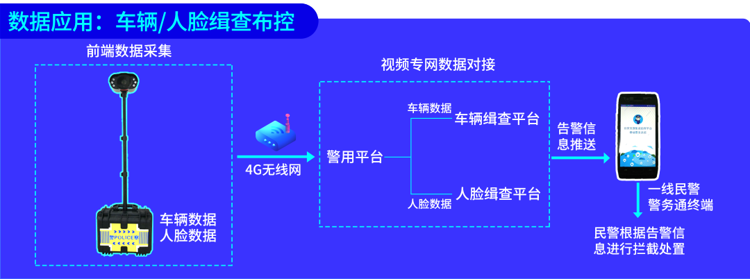 若前端設備未能導入黑名單,設備將采集到的人臉數(shù)據(jù)和車輛數(shù)據(jù)上傳到集指平臺,由集指平臺進行黑名單數(shù)據(jù)比對和消息推送,通過警務通手機或者對講機指揮現(xiàn)場進行布控車輛攔截。