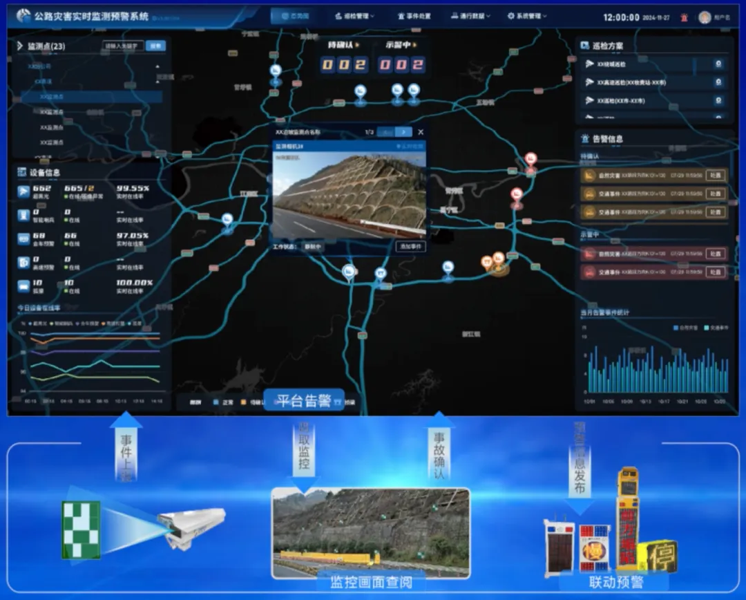 信路威新推出第一代“災(zāi)害(邊坡/橋梁)在線監(jiān)測及智能預(yù)警系統(tǒng)”,依托信路威視覺大模型,實現(xiàn)全天候精準(zhǔn)監(jiān)測,實時感知路面異常。當(dāng)系統(tǒng)檢測到異常時,立即觸發(fā)“AI監(jiān)控報警-云端確認(rèn)與處置-現(xiàn)場聲光示警聯(lián)動”三級響應(yīng)機(jī)制,快速提醒監(jiān)控人員處理,并聯(lián)動現(xiàn)場示警設(shè)備。通過開啟紅藍(lán)閃爍燈、高亮LED屏及語音播報等多模態(tài)預(yù)警手段,主動引導(dǎo)后續(xù)車輛,提示前方道路異常,有效降低道路安全事故發(fā)生概率。事件處置完成后,系統(tǒng)會自動生成詳細(xì)報告。系統(tǒng)廣泛適用于山區(qū)公路、高速公路的高危邊坡及橋梁的安全監(jiān)測。