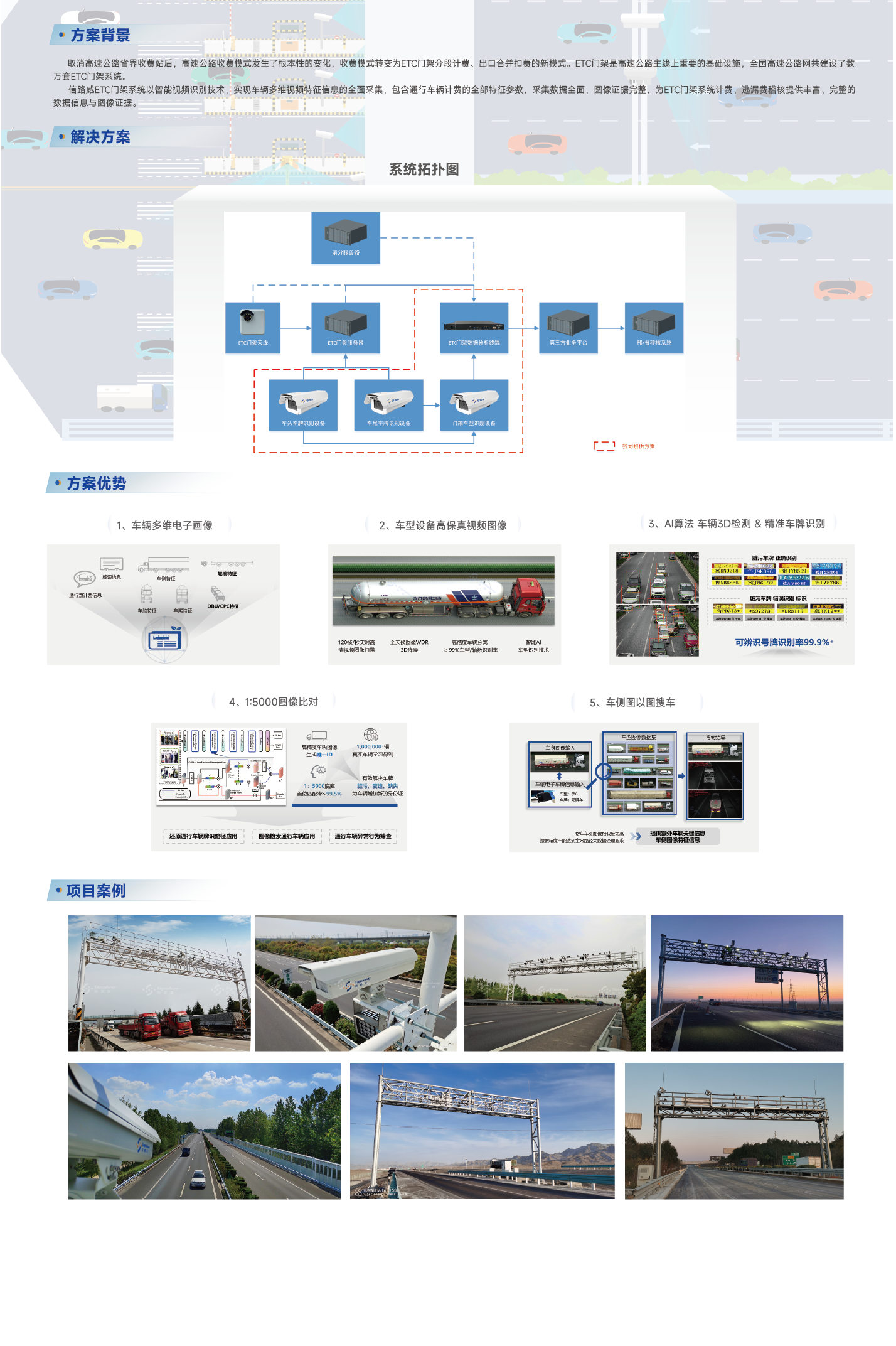 信路威ETC門架系統(tǒng)以智能視頻識別技術(shù),實現(xiàn)車輛多維視頻特征信息的全面采集,包含通行車輛計費的全部特征參數(shù),采集數(shù)據(jù)全面,圖像證據(jù)完整,為ETC門架系統(tǒng)計費、逃漏費稽核提供豐富、完整的數(shù)據(jù)信息與圖像證據(jù)。