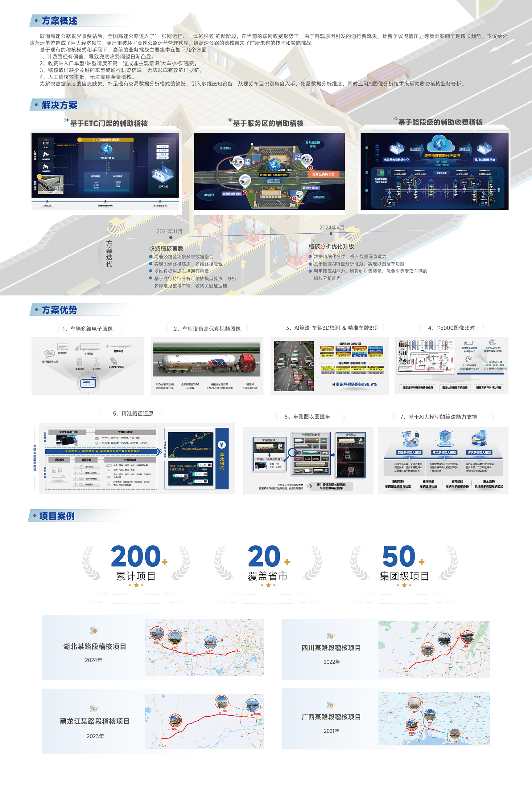 高速公路稽查(逃費)系統(tǒng),是基于大數(shù)據(jù)+智能視頻技術(shù)的高速公路智能打逃/稽查管理系統(tǒng),利用信息技術(shù)手段,重點針對高速公路運營管理面臨的突出問題,整合現(xiàn)有信息資源,采用頂層設(shè)計的辦法,采用最先進的大數(shù)據(jù)+高清智能視頻技術(shù),獲取車輛信息和數(shù)據(jù),勾繪出車輛從進入高速公路至駛離高速公路的可視化路徑,采用數(shù)據(jù)挖掘和圖像比對技術(shù),實現(xiàn)車輛信息采集、車流量監(jiān)測和統(tǒng)計、車輛交通違法行為和打逃行為識別取證等功能。并以此為基礎(chǔ),建立“高清化、可視化、可控化”的高速公路車輛信息大數(shù)據(jù)中心,為高速公路聯(lián)網(wǎng)收費系統(tǒng)提供打逃車輛信息服務(wù),杜絕車輛的逃費行為,提高高速公路管理效率,為物聯(lián)網(wǎng)、車聯(lián)網(wǎng)提供車輛信息服務(wù),為實現(xiàn)“智慧高速和自由流收費”奠定堅實的基礎(chǔ)。